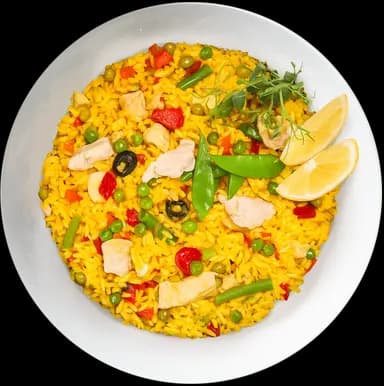 Lockerer Reis nach spanischer Art mit Hähnchenfleisch, Gemüse und Safran, fein mediterran abgeschmeckt.